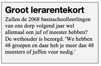 De leerlingen krijgen een nieuwbericht te lezen waarin staat dat er een tekort aan leraren is. In het artikel wordt genoemd dat er in een bepaalde streek 2086 kinderen op de basisscholen zitten, verdeeld over 48 groepen. De vraag aan de leerlingen is of die twee getallen bij elkaar passen. Kan het wel kloppen wat daar staat?