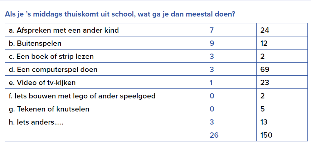 Er is een onderzoekje uitgevoerd onder 150 leerlingen van groep 7 en 8 over de vraag wat ze het liefst deden als ze uit school komen. In de laatste kolom van de onderstaande tabel zie je wat deze leerlingen hebben opgegeven. De 26 leerlingen uit de klas van Tamara hebben het onderzoekje ook in de eigen groep uitgevoerd. Hun gegevens staan in de voorlaatste kolom.